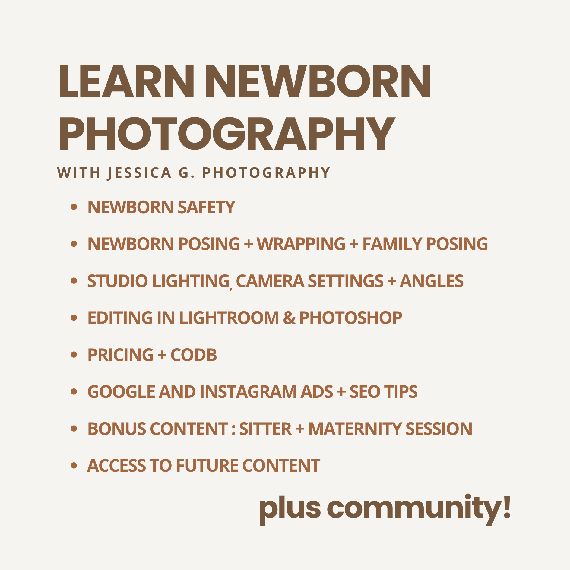 Your one-time registration gives you lifetime access too all content on the "Mastering Newborn Photography with Jessica G." education group.